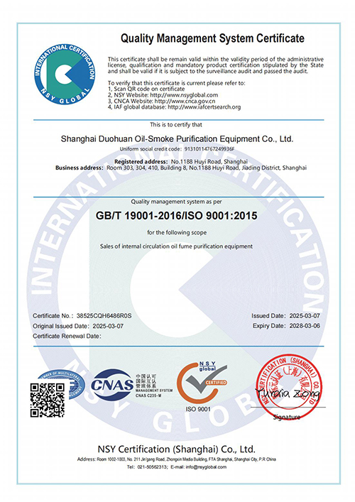 ISO9001認(rèn)證 是全球公認(rèn)的質(zhì)量管理標(biāo)準(zhǔn),它代表著國際社會對上海多環(huán)油煙凈化設(shè)備有限公司產(chǎn)品質(zhì)量的認(rèn)可,也標(biāo)志著多環(huán)公司在規(guī)范化、標(biāo)準(zhǔn)化、國際化的道路上邁出了堅(jiān)實(shí)的一步。